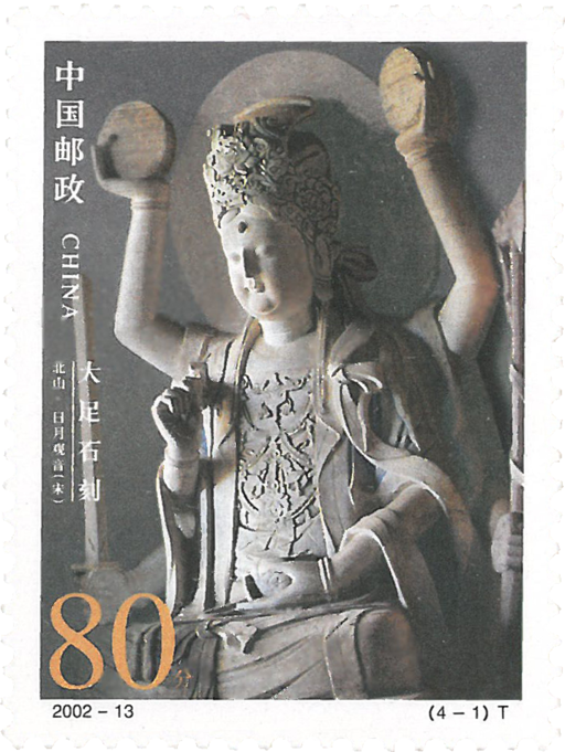 大足石刻是重庆市大足县境内80处5万余尊石刻造像的总称,始创于初唐永徽年间,盛于两宋时期。大足石刻以佛教造像为主,兼有儒、道等造像,它集中国石刻艺术之大成,是石窟艺术生活化的典范,生动地反映了中国民间宗教信仰的重大发展变化,把中国石刻艺术推上了一个新的高峰。1999年大足石刻被联合国教科文组织列入《世界遗产名录》。这套邮票的5个图案选自北山、宝顶山、石门山的宋代石刻造像,主图分别为日月观音、普贤菩萨、华严三圣、三皇洞造像和千手观音。小型张图案所表现的千手观音高7.7米,宽12.5米,占壁面积88平方米,以写实、夸张、象征等不同手法刻出的1007只手令人叹为观止,为"手雕之绝"。