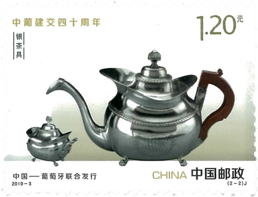 中国与葡萄牙于1979年2月8日建立外交关系,建交以来,两国关系稳步发展,双方高层互访频繁,各级别往来日益密切,经贸关系不断加强,文化、教育等多领域的合作富有成果。2005年12月两国建立全面战略伙伴关系。2018年12月, 习近平主席应邀对葡萄牙进行国事访问,取得圆满成功,推动中葡传统友好合作进入新的发展阶段。2019年是中葡建交40周年,两国邮政联合发行纪念邮票1套2枚,邮票图一选取中国的紫砂茶具,画面以紫砂壶为主体,一旁为紫砂茶杯。以紫砂壶为代表的紫砂茶具是江苏宜兴特有的陶土工艺品。邮票上的紫砂壶器型优美,以南瓜型的壶体和瓜藤型的提梁而富有自然情趣,现藏于宜兴市阳羡紫砂陶博物馆,其制 作者是“宜兴紫砂制作技艺”代表性传承人汪寅仙。邮票图二选取葡萄牙的银茶具,画面以银茶壶为主体,一旁为银质糖罐。邮票上的银茶壶器型精美,壶身上有装饰纹样,底部有圆形四足,配木制手柄,于19世纪早期出产于葡萄牙港口城市波尔图,现藏于葡萄牙拉梅古博物馆。