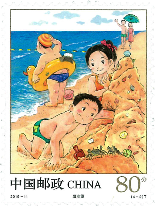 游戏是儿童的天性释放,是童年最美好的回忆。幸福快乐的童年,往往是在与小伙伴的游戏中度过的。无穷无尽的想象空间、诉说不完的童真童趣、随时随地进发而出的创造力,恰恰蕴藉在游戏当中。本套邮票描绘了拼拼图、堆沙堡、滑轮滑、搭积木四种广受现代儿童喜爱的游戏,两种益智类、两种体育类。四枚邮票按照春夏秋冬的概念进行设计,拼拼图和搭积木表现了春季和冬季, 为室内场景;堆沙堡和滑轮滑表现了夏季和秋季,为室外场景。邮票通过独特的构图来表现主题,画面色彩靓丽,入物鲜活生动。设计者还在四枚邮票的画面中设计了12只小猪,此外还隐藏了许多的小彩蛋等你来发现,在紫外灯下观察,同样的邮票画面将会呈现出不一样的精彩。版式二边纸则安排了在草坪上散落着的书包、草帽、脚踏车,呈现出一幅夏日午后天真无邪的悠闲场景,让成年人串起无数的童年回忆。