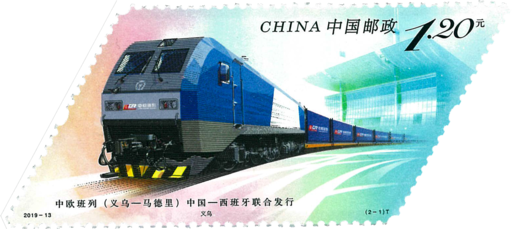 中欧班列是指按照固定车次、线路、班期和全程运行时刻开行,往来于中国与欧洲以及“一带一路”沿线国家间的集装箱等铁路国际联运列车,为服务我国对外经贸发展、推进“一带一路”建设提供了运力保障。其中,义乌到马德里中欧班列,是所有中欧班列中运行里程最长的一条。2014年11月18日,首趟中欧班列(义鸟-马德里)从义乌发往马德里,全程1.3万公里,途经8个国家,极大地促进了中国和西班牙之间的贸易往来。该套邮票为中国邮政与西班牙邮政联合发行。邮票以平行四边形的形式呈 现,主图选自国际上最先进的班列,中国与西班牙两个列车图形保持对称,并向外延展,两枚邮票相连,代表着中欧班列是连接两个国家的经济纽带,体现中国与西班牙的友好外交。列车下方设计白色的经纬线,蕴含着同一个地球,寓意中欧班列不远万里连接起义鸟和马德里。