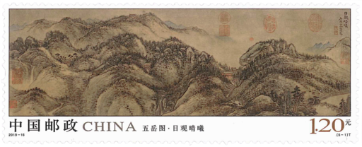 《五岳图》卷,明代宋旭作,绢本设色。全卷共分五段,每段纵24.7厘米、横约75.9厘米,分别描绘了五岳各自的特定景色。其中“日观晴曦”刻画的是山东泰山旭日东升的景象;“太华清秋”描绘的是陕西华山清秋时节山林的风貌;“融峰雨色”表现的是湖南衡山祝融峰的雨景;“恒塞积雪”呈现的是山西恒山白雪皑皑的景观;“二室争奇”展现的是河南嵩山太室山、少室山的壮观景致。此图卷作为宋旭将实景山水与传统技法、文人情怀完美结合的典范之作,不仅为五岳存形于纸绢间增添了别样的神采,也对后人的实景山水画创作产生了深远的影响。