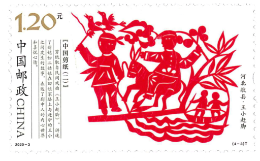 中国剪纸是我国广大劳动人民在生产和生活实践中创作出来的一种平面剪刻艺术,它历史悠久,分布地域广阔,具有鲜明的民族艺术特色,是我国优秀的非物质文化遗产之一。本套邮票展现了四件具有代表性的北方剪纸作品:山东胶东·三娘教子、陕西安塞·腰鼓贺春、河北献县·王小赶脚、吉林通化·吉祥采参路。