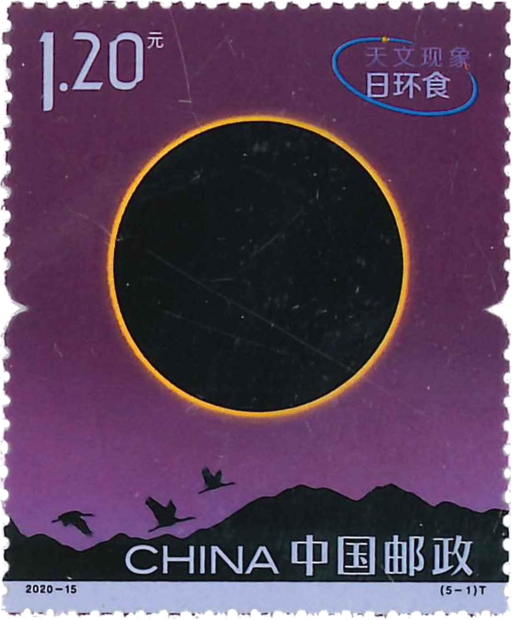 天文现象是天体到了某个特定位置(客观上的位置)或状态而形成的特殊现象。天文学是人类最古老的自然科学之一,对推动人类社会进步产生了重要作用。本套邮票展现了五种天文现象,分别为:日环食、月全食、流星雨、大彗星、水星凌日。根据天文现象发生的规律特点,五枚邮票的底部分别设计了五种动物和地貌的剪影。在紫外灯照射下,能清晰地看到整套邮票黑色剪影边缘的荧光效果。为突出天文现象的各自特点,五枚邮票分别采用不同工艺印制。