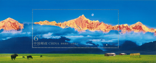香格里拉位于我国云南省西北部,是迪庆藏族自治州州府驻地。“香格里拉”一词,藏语意为“心中的日月”,是1933年英国作家詹姆斯·希尔顿在小说《消失的地平线》中描绘的中国藏区一个和平、宁静之地。邮票“霞蔚古寺”表现的是噶丹·松赞林寺的景色。噶丹·松赞林寺位于云南省香格里拉县城北佛屏山麓,始建于公元1679年,占地500余亩,是云南藏区规模最 大的藏传佛教寺院,有“小布达拉宫”之誉。邮票“碧水青天”中的景致取自纳帕海自然保护区。纳帕海自然保护区位于香格里拉县西北,海拔3266米。纳帕海为季节性湖泊,枯水时部分为沼泽草甸,是重要的牧场,也是珍稀动物的重要栖息地。邮票“平湖叠翠”表现了普达措国家公园中的美景。普达措国家公园位于香格里拉县城东北,总面积近2000平方千米,是我国最大的国家公园。邮票“雪域古城”展现了独克宗古城的风貌。独克宗古城位于香格里拉县城东南部,历史悠久,在唐宋时期就是滇、川、藏茶马互市的重镇,是藏区保存最完好的古城之一。邮票小型张“日照金山”展示的是梅里雪山的壮美景色。梅里雪山位于迪庆藏族自治州德钦县西北横断山脉中段,是怒江与澜沧江的分水岭。梅里雪山海拔在6000米以上的雪峰有10余座,俗称“太子十三峰”。主峰卡瓦格博峰是云南第一高峰,被藏民称为“雪山之神”。