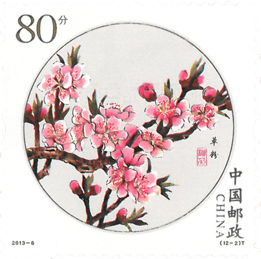 桃花是我国最古老的名花之一,历史久远,早在《诗经》中就有关于桃花的诗句:“桃之夭夭,灼灼其华”。我国桃花品种极为丰富,复瓣形似梅红人,重瓣形似牡丹,红的耀眼,灼灼欲燃;白的夺目,莹莹似雪;粉的如妆,娇媚可人。姚花每年三四月间开放,花期可持续一个月左右。邮票展示了十二个桃花品种,分别是:白碧桃、单粉、品霞、紫叶桃、瑕玉寿星、碧桃、五宝桃、照手红、绿萼垂枝、二色桃、菊花桃、绯桃。