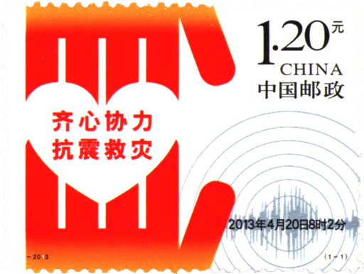 此枚邮票构图由双手和爱心组成。寓意在突发的自然灾害面前,全国各族人民同灾区人民心连心、手牵手,齐心协力、共克时艰。邮票中地震波上”2013年4月20日8时2分“的标注,将时间停留在灾难发生的那一瞬间。
