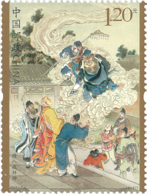 《西游记》是中国四大古典文学名著之一,作者吴承恩(1500-1582),出生于淮安府山阳县(今江苏淮安市淮安区河下古镇)。现其家乡建有吴承恩故居和墓园。2015年发行的《中国古典文学名著一<西游记>(一)》开启了“西游记”系列邮票的大幕。2017年发行的第二组选自第十五回到第二十四回的内容,由著名艺术家李云中精心创作,表现了智收白龙马、猪八戒拜师、流沙河收沙僧和偷吃人参果四个故事。智收白龙马:取自第十五回“蛇盘山诸神暗佑鹰愁涧意马收缰”。白龙马,本是西海龙王三太子,因纵火烧毁玉帝赏赐的明珠,触犯天条,犯下死罪,幸亏观音菩萨出面才免于死罪,被贬到蛇盘山鹰愁涧。当行者服侍唐僧路过此地,突然钻出一条龙来,将唐僧所骑白马一口吞下。这时观音菩萨差来一路神祗,将此龙点化,锯角退鳞,变身为白龙马,皈依佛门。取经路上供唐僧坐骑,任劳任怨,历尽艰辛,终于修成正果。猪八戒拜师:取自第十九回“云栈洞悟空收八戒浮屠山玄奘受心经”。悟空在高老庄降妖,妖怪逃回福陵山云栈洞的老巢,入洞取出九齿钉耙和悟空大战,战败后问悟空为何多管闲事,悟空自报在保护唐僧取经,妖怪忙丢下钉耙,跟悟空去拜见唐僧。原来这妖怪原是上界天蓬元帅,因调戏嫦娥被贬下凡,在云栈洞为妖,后被观音点化,取名猪悟能,在此等候,保护唐僧西天取经。唐僧大喜,因和尚不得食用五常三厌给他取名猪八戒,收他做了二徒弟。流沙河收沙僧:取自第二十二回“八戒大战流沙河木叉奉法收悟净”。师徒三人来到流沙河,河中跳出一个妖怪,要抢唐僧。八戒三战妖怪,妖怪却钻入水中,隐迹潜踪,渺然不见。于是悟空前往南海请观音收服。观音说明此妖怪是卷帘大将,失手打碎琉璃盏,被贬下界,派遣木叉与悟空来收服。沙僧奉木叉命令,取下自己项下由九个骷髅头连接而成的项链,将葫芦安放在中间,结成一只法船,木叉护送唐僧过河,师徒四人辞别木叉继续西行。偷吃人参果:取自第二十四回“万寿庄大仙留故友五庄观行者窃人参”。师徒四人来到五庄观住下。这里有树结人参果,吃后长生不老。观主有事离开,命二童子将人参果给唐僧吃,好好招待。唐僧误认为人参果为婴儿而未敢食,二童子便吃了,被悟空三人发现,勾起了馋虫。悟空偷果三个,与八戒、沙僧分食。二童子大骂唐僧,悟空难忍,将树弄倒。后孙悟空请来南海观世音菩萨,用神水把人参果树救活后,继续西行取经。西游记>