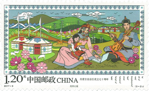 亮丽北疆:表现了蒙古族群众在蒙古包前欢歌笑语,牧草茂盛、牛羊成群,中景奔跑的马儿,风力发电,电线电网、公路、电塔点缀在辽阔的草原上,体现了七十年来,在经济、科技、文化、生态建设等方面的成就。