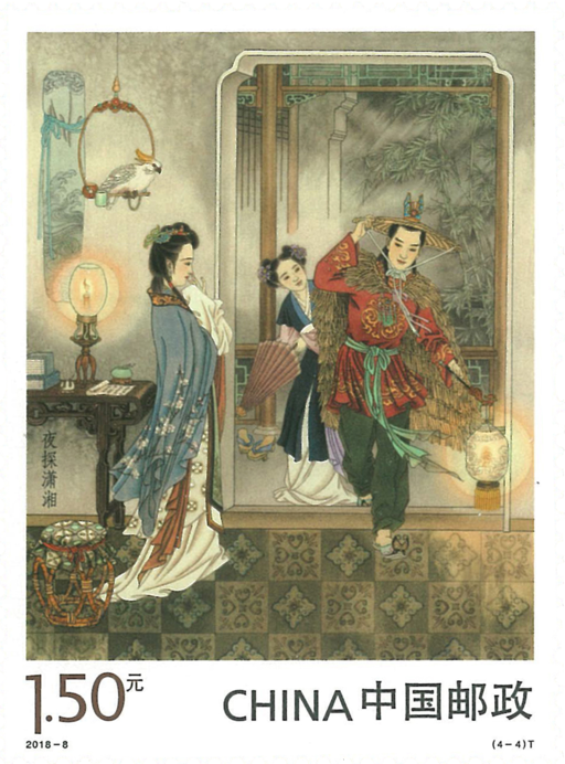 小型张“雅结海棠社”见第37回。在探春的倡议下,大观园诸人在秋爽斋偶结海棠社。探春之诗气韵高洁,宝钗之诗含蓄浑厚,黛玉之诗风流别致,皆寄寓着个人的身世之感,同时也预示着将来的命运。