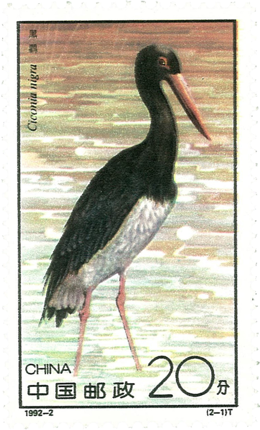 在这2枚邮票的图案设计中,作者刻意追求一种对称美,收到了良好的艺术效果。从鹳种看,一只黑鹳,一只白鹳,刚好黑、白对称;在衬底的着色上,一枚偏棕黄,一枚偏灰绿,形成明暗、冷暖对比;在构图上,黑鹳双腿着地,悠然自得,慢踱方步,羽毛整洁,而白鹳单腿伫立,垂首略作小憩,羽毛未及梳理,仿佛刚从湖中嬉水而出,两鹳动、静姿态对称;若把2枚邮票排列一起,则一鹳朝东,一鹳朝西,相互呼应。在国名、票名、面值等文字的布局上,2枚邮票也是相互对应、平稳得体。