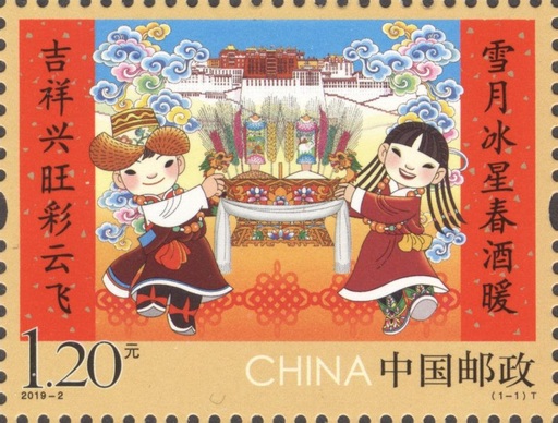 该套邮票是《拜年》系列的第五套。邮票主图为“欢欢”、“喜喜”,背景衬以位于西藏拉萨的布达拉宫。“欢欢”和“喜喜”身着藏族传统服饰,手捧象征吉祥的切玛,在藏民族聚居区向全国各族人民拜年。画面两侧楹联文字为“雪月冰星春酒暖吉祥兴旺彩云飞”。整个画面轻松愉悦,洋溢着新年的喜庆气氛。