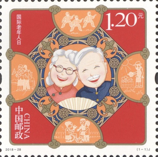 该套邮票运用中心对称构图进行设计,并通过五个场景表现与老年人息息相关的五个原则。画面中间部分用漫画手法表现了一对幸福、恩爱的老夫妇形象,围绕在周围的中国传统纹饰图案传递出对老年人福寿安康的美好祝福,该场景体现老年人独立原则。邮票上下左右四个半圆内的图案分别为老年人打太极拳、做园艺、康复医疗、做志愿者等场景,分别体现尊严原则,自我实现原则,照顾原则和参与原则。