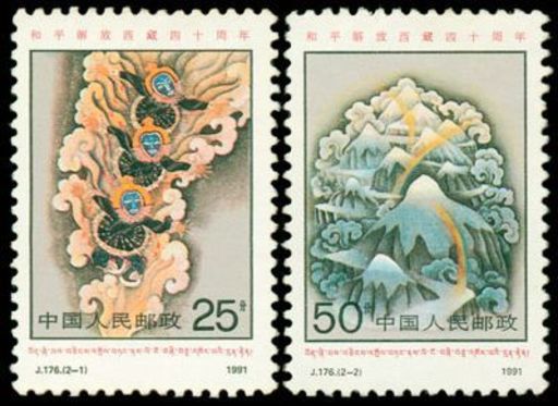 2枚邮票均在画面外上下两端设计了汉文与藏文“和平解放西藏四十周年”。