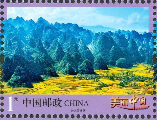 《美丽中国》普通邮票第二组延续了第一组的设计风格,选取我国东南西北各地风光,其地貌差别大,风景多样,方寸之上展示了我国的幅员辽阔,山川秀美。第一图黑龙江省牡丹江市双峰林场雪乡,表现冬季积雪覆盖的北国风光;第二图贵州省兴义市万峰林,其喀斯特地形地貌典型突出,形成了独特的锥状喀斯特地质景观;第三图宁夏回族自治区石嘴山市沙湖,沙漠与水域毗邻而居,既有大漠戈壁之雄浑,又有江南水乡之秀美,画面表现了当地良好的自然和生态环境;第四图浙江省杭州市西溪湿地,为国家湿地公园,其间水道如巷、河汊如网,鱼塘栉比、诸岛棋布,动植物资源丰富。