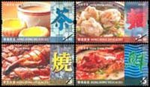 一套四枚邮票展现各款令人垂涎的佳肴美食,邮票右方的背景分别为传统茶餐厅内常见的纸皮石墙($1.40),面店厨房的橱窗($2.40),烧味店外的招牌($3),以及海鲜酒家的霓虹灯箱($5),以「茶」、「面」、「烧」、「鲜」四个大字点出地道美食的精髓。小全张以中西餐具的图案衬底,与主题互相呼应。