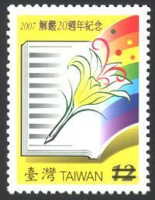 民国38年5月19日台湾省政府主席兼台湾省警备总司令陈诚先生颁布戒严令,公告台湾自38年5月20日零时起实施戒严,台湾从此进入戒严时期。戒严限制了宪法赋予人民的权益,影响民主宪政的发展。随着社会经济发展的演变,人权法治思想的普及,为推动民主宪政改革,蒋故总统经国先生于民国76年7月14日明令宣布,自76年7月15日零时起解严,正式解除长达30余年的戒严,也为台湾民主改革踏出历史性的一步。本(96)年适逢解严20周年,台湾中华邮政配合规划以解严后开放报禁、党禁及言论自由为主题,发行「2007解严20周年纪念邮票」1枚,面值新台币12元,以资纪念。