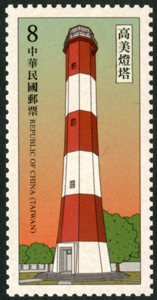 一、高美灯塔(面值8元):位于台中港北方高美海滨,民国56年建造,塔身为红白横纹相间的八角形钢筋混凝土建筑,目前停用中,位在高美湿地,被当地人视为重要的人文景观。