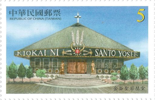 ㄧ、金仑圣若瑟堂(面值5元):位于台东县太麻里乡,是一座富有排湾族文化特质的圣堂。圣堂的外观是「瓮」形,屋顶的「瓮口」,由玻璃覆蓋,阳光可以穿透,屋顶上设置立体十字架。在圣堂正门上方,装饰著头目的头饰,两侧的菱形窗及下方的石头纹路,仿佛两条百步蛇,守护着圣堂。