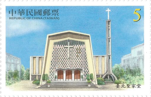 二、台北圣家堂(面值5元):座落于台北市大安区,是台湾知名的天主教教堂。由长方形小彩色玻璃组成的墙面上,高悬著巨大的十字架和圣堂名称。右侧是一座高耸的钟塔,塔顶是十字架,塔底有一尊来自比利时的「穷人之母」圣母像,俯首宁静地祈祷。
