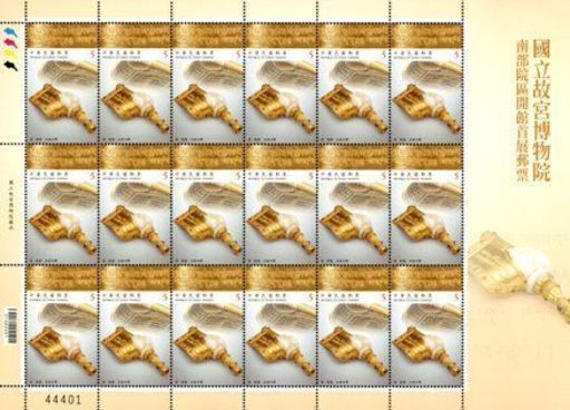 国立故宫博物院南部院区落成开馆,为宣传该院典藏之亚洲艺文珍品,台湾中华邮政特选取4件该院首展展品为题材,规划邮票1组3枚及小全张1张。图案简介如下: