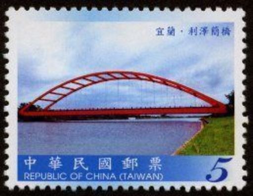 一、宜兰利泽简桥(面值5元):横跨冬山河,为无桥墩设计的单孔钢系拱桥。民国81年6月通车,桥长148公尺,宽22公尺,拱高26公尺,桥身红色,长虹卧波红绿相映,成为冬山河上醒目地标。