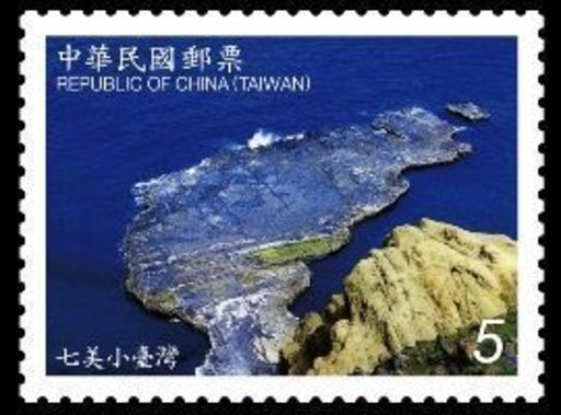 (一)七美小台湾(面值5元):系位于七美屿东岸的海蚀平台,由于经年累月海浪拍蚀,刻画出酷似台湾岛屿形貌而得名。