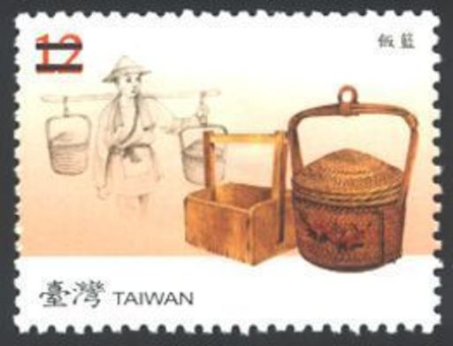 三、饭篮(面值12元):先民使用的饭篮有竹编与木材两种,竹编的饭篮形式类似谢篮,而木制的则为四方形篮。其主要功能为提拿食物之用。