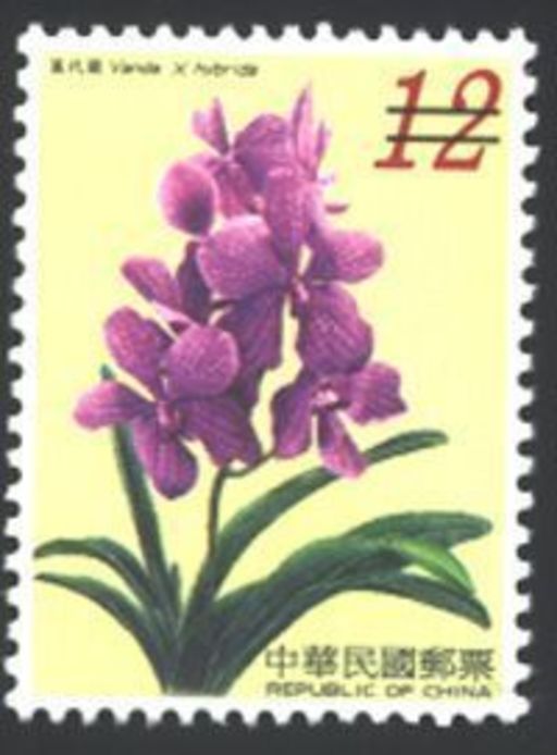 (三)万代兰(面值12元):单茎类着生性兰花;喜欢生长在温暖、阳光充足、湿度够的环境;属名Vanda,梵文意指「附生在树上的花」,靠着发达的气生根,截取空中水分及养分,直立茎粗壮,叶片硬而厚,抗旱、耐强光。