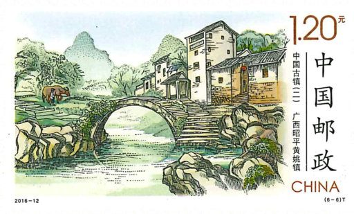 中国古镇是我国文化遗产的重要组成部分,反映了不同地区、不同民族、不同经济社会发展阶段聚落形成和演变的历史过程,真实地记录了传统建筑风貌、优秀建筑艺术、传统民俗民风和原始空间形态。近年来,随着国际社会和我国政府对文化遗产保护的日益关注,历史文化名镇、名村保护与利用,已成为地方经济社会发展的重要组成部分。本套邮票选取了六座历史悠久、风景优美、人文荟萃的历史文化名镇。江苏姜堰溱潼镇地处南通、盐城、泰州三市交界处,古称秦泓,元世祖至元十四年(1277年)设置泰州路,此间溱潼始称为镇。这里有著名的“溱湖八景”,充满浓郁的水乡风情。湖北红安七里坪镇位于鄂豫两省交界处的大别山南麗,全国重点镇和首批中国历史文化名镇,又是以黄麻起义策源地、鄂豫皖革命根据地中心和红四方面军、红25军、红28军诞生地而深植“红色基因”的著名革命历史名镇。贵州贵阳青岩镇坐落在黔中腹地贵阳是明清时期的一座古镇,地近苗乡,以前曾是军事重镇,又曾是远到川、湘、滇、桂的通衢,往来的商贾都要由此经过。上海青浦朱家角镇位于青浦区中南部,历史悠久,镇内小桥流水,古意盎然,素有“江南明珠”之称。安徽肥西三河镇地处合肥市肥西县南端,尤以镇中“八古”景观最为著名。表现了三河最具代表性的建筑风格和人文风情。广西昭平黄姚镇地处桂林漓江下游,素有“梦境家园”之称。表现了著名的带龙桥,始建于明代万历年间,是黄姚古桥梁中最有代表性的,也是古镇景致的地标。