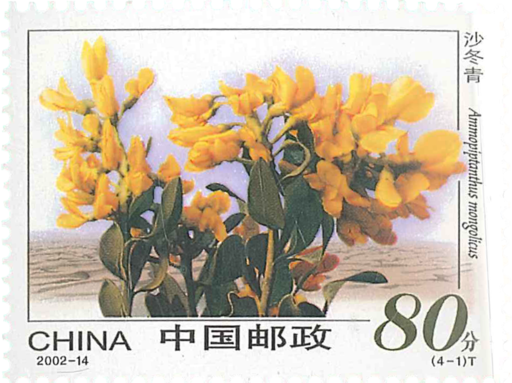 我国国土沙漠化面积约为192万平方公里,是世界上受荒漠化危害最为严重的国家之一。沙漠化严重影响着我国人民的生存环境并制约着经济建设的发展.治理沙漠已刻不容缓。保护沙漠植物及沙漠植被是治理沙漠的基本措施,现存的沙漠植物是人类治理沙漠的重要武器。我国的沙漠植物种类贫乏,大约有700种,它们在长期的自然进程中,以各种不同的生理和生态形式适应了沙漠地区的生态环境。邮票图案中的沙漠植物选自沙漠各类生态环境中常见的特别优良的固沙植物种类,其中沙冬青是我国沙漠中唯一的常绿灌木植物;红皮沙拐枣是在流动沙地固定沙丘的优良植物;细枝岩黄蓍为国沙优良植物;细穗柽柳是沙漠绿化造林的优良树种,也是戈壁居民常种的绿化植物。