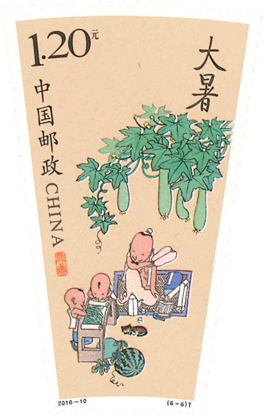 中国是一个历史悠久的文明古国,人民从亲身实践中认识总结了丰富的生产和生活经验,二十四节气堪称人民智慧的结晶。二十四节气起源于我国黄河流域,到秦汉时期,二十四节气已经完全确立。节气习俗和节日活动共同组成了中华民族的岁时节令文化,在几千年的历史长河中不断完善和发展,历代传承。农历二十四节气既包括相关的谚语、歌谣、传说等,又有传统生产工具、生活器具、工艺品、书画等艺术作品,还包括与节令关系密切的节日文化、生产仪式和民间风俗。二十四节气是中国古代农业文明的具体表现,具有很高的农业历史文化的研究价值,反映了社会各阶层的生活风貌、礼仪交往、文化思想、民俗娱乐等。节气既是人们对天文、气象、物候的科学认识总结,也是古代历法的创造之一。节气将一年内太阳运行的位置变化及由此引起的地面气候演变秩序,划分为24个阶段,每段约隔半个月时间,然后分配在12个月里,以反映四季、气温、物候等情况。本套邮票发行立夏、小满、芒种、夏至、小暑、大暑六个节气。