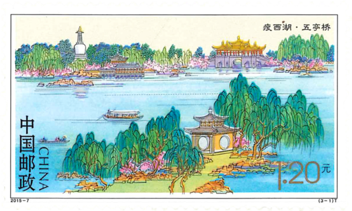 《瘦西湖》邮票采用了新中国第一代邮票设计家孙传哲生前的创作作品,以工笔勾线的画法,展现了五亭桥、白塔、二十四桥等标志性景点,画面精巧别致,意境广阔。