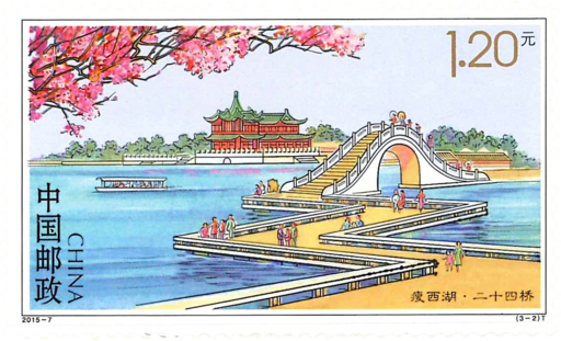 《瘦西湖》邮票采用了新中国第一代邮票设计家孙传哲生前的创作作品,以工笔勾线的画法,展现了五亭桥、白塔、二十四桥等标志性景点,画面精巧别致,意境广阔。