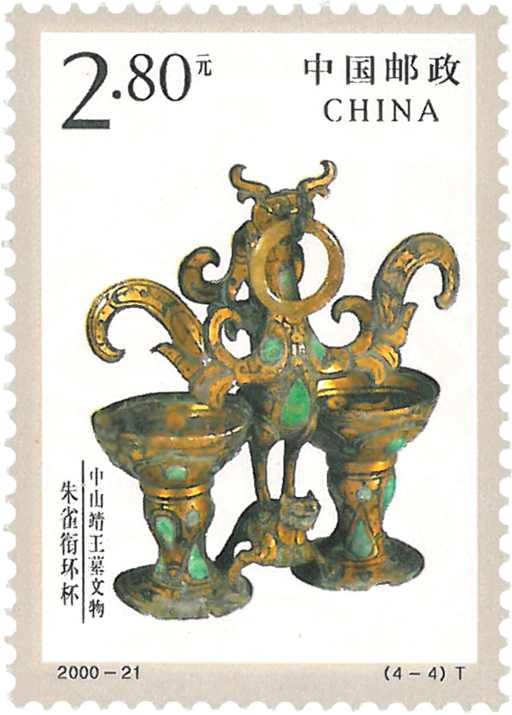 中山靖王墓是西汉中山靖王刘胜及其妻窦绾之墓。在河北满城县城西南约1.5公里处陵山主峰东坡,凿山为陵坐西朝东,墓室庞大,随葬品豪华奢侈。两墓出土金、银、铜、铁、玉、石、陶、漆等物品,丝织品、银鸟篆壶和医用金针共一万多件。其中有:长信宫灯,高48厘米,铜质鎏金,作宫女跪坐执灯状,可调节灯光的照度和照射的方向,灯盘、屏板、灯罩及“侍女”的头部都能拆卸,以便清洗。据宫灯铭文得知此灯于汉文帝前八年铸造。错金博山炉,是一种熏炉,高26厘米,通体金丝错出精致的纹饰。工艺之精湛,举世罕见。刘胜一生嗜酒如命,墓中各色青铜酒器目不暇接。蟠龙纹铜壶是其中一件,高59.5厘米,壶身有鎏金龙纹。朱雀衔环杯的造型别开生面,雀嘴衔环翩翩起舞状。本套邮票中的“长信宫灯”曾见于1973年11月20日发行的编号(73)邮票,这次是再现方寸。