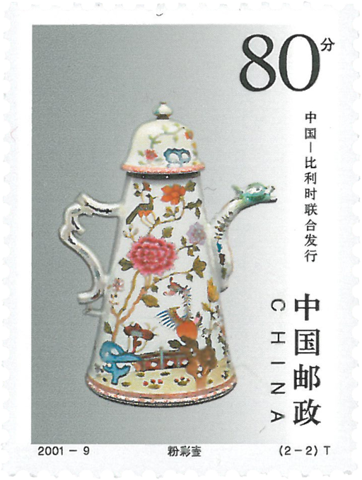 为增进中国与世界各国邮政的交往和文化交流,2001年6月12日国家邮政局与比利时联合发行《陶瓷》邮票一套2枚,邮票图案由中国的“陶器”和比利时的“瓷器”两图组成。中国选取了1958年甘肃出土的,距今5000多年前的属新石器时代庙底沟类型的彩陶瓶,比利时选取了现藏于布鲁塞尔皇家艺术博物馆的中国清代景德镇定烧瓷粉彩壶。